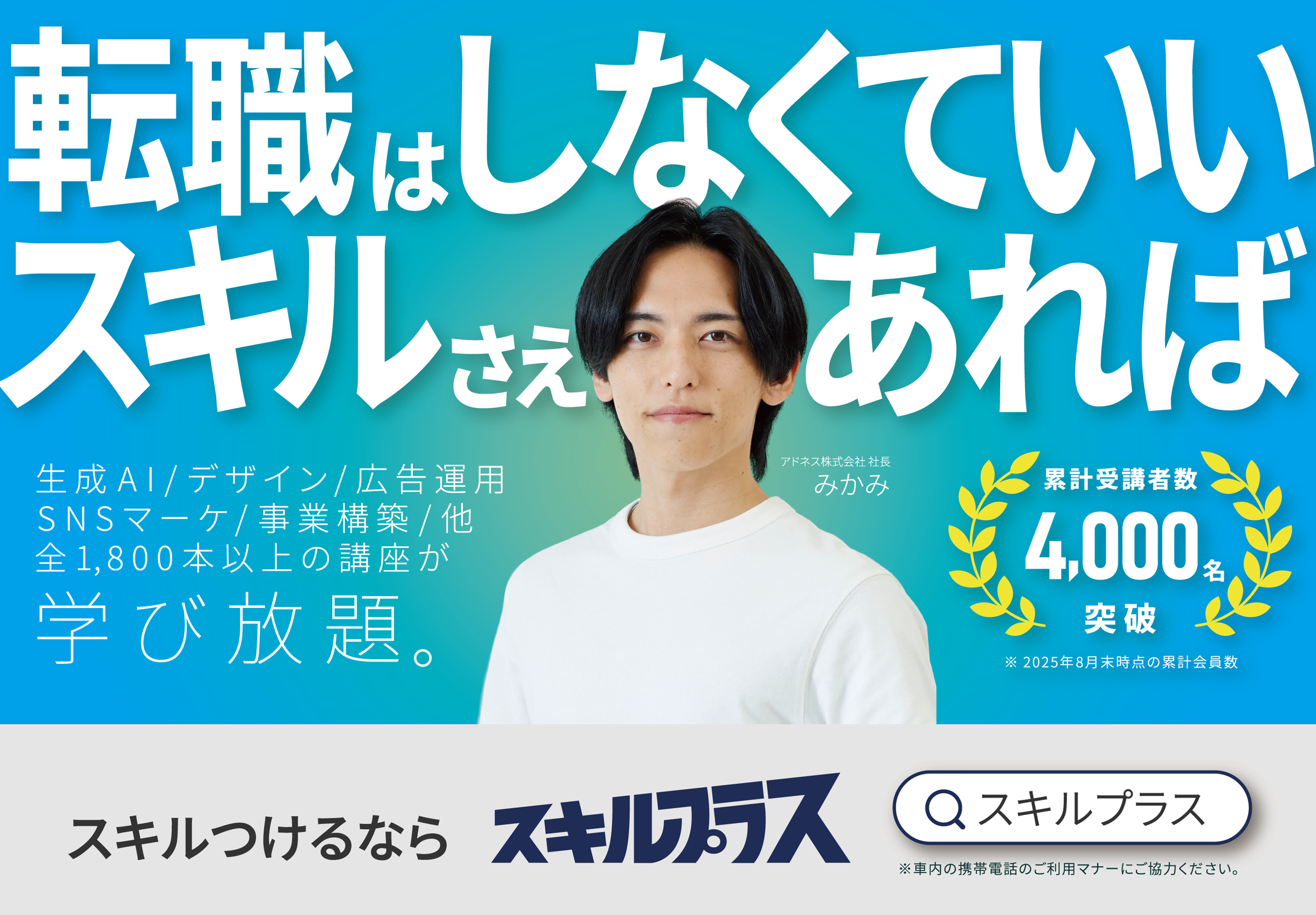生成AIイノベーションのグローバルリーダー、アドネス株式会社(本社:東京都新宿区四谷、代表取締役社長:三上功太)は、社会人のための実践型スキル習得プログラム「スキルプラス」の電車広告を、2025年12月1日(月)よりJR西日本の快速列車にて新たに掲出いたします。本施策は、同時期に開始しているテレビCM放映と連動し、東京・名古屋・大阪で展開してきた交通広告の取り組みをさらに拡大するものです。通勤者の日常の視点に寄り添いながら、“転職ではなくスキルで働き方を変える”という新たな選択肢を提案します。 ■電車広告実施の背景 在宅勤務や柔軟な働き方への関心が高まる一方、「現職では実現が難しいため転職を検討している」という声も多く聞かれます。アドネスは、このような社会人に対し 「転職ではなく、スキル習得によって働き方を変える」 という選択肢を伝えるため、生活動線上での接触頻度が高い電車広告を選択しました。広告には代表・三上のビジュアルを採用し、サービス認知の向上とともにブランドに対する信頼性・親近感の醸成を図ります。 【掲出概要】 <大阪> 掲出期間:2025年12月1日〜3月31日 掲出路線:JR西日本(快速) 広告種類:ドア横B3ポスター(650枚) 【掲出実績】 <東京> 2025年10月1日〜10月31日/東武東上線/ドアステッカー(1,620枚) 2025年10月6日〜11月5日/相鉄線/ドア横B3ポスター(550枚) <大阪> 2025年9月1日〜3月31日/北大阪急行/ドア横B3ポスター(170枚) 2025年10月1日〜10月31日/JR西日本(普通)/ドア横B3ポスター(1,200枚) <名古屋> 2025年10月1日〜10月31日/名古屋市営地下鉄[1] [2] /ドアステッカー(840枚) ■スキルプラスについて 「スキルプラス」は、特許取得のAI技術「サクセスラーニング®」を応用した、実践型スキル習得サービスとして展開しています。多様なコースからビジネススキルを幅広く学習するための実践型スキル習得サービスとして展開しています。自分らしい働き方を実現。全1,800本以上の講義動画とAIラーニングシステムによる明確なアクションマップで、ゲーム感覚でスキルを学ぶことができます。 【公式アカウント】 サービスサイト: https://skillplus.addness.co.jp/ YouTube: https://www.youtube.com/@skillplusTV 【会社概要】 社 名 :アドネス株式会社 本社所在地 :東京都新宿区四谷4丁目3-50 四谷トーセイビル5F 代 表 者 :代表取締役社長・三上功太 設 立 :2021年7月26日 事 業 内 容 :次世代型教育事業、Webマーケティング支援事業
