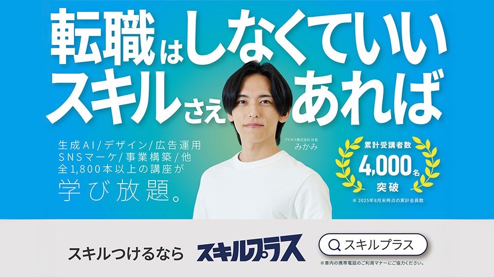 生成AIイノベーションのグローバルリーダー、アドネス株式会社(本社:東京都新宿区四谷、代表取締役社長:三上功太)は、社会人のための実践型スキル習得プログラム「スキルプラス」の電車広告を、2025年12月1日(月)よりJR西日本の快速列車にて新たに掲出いたします。本施策は、同時期に開始しているテレビCM放映と連動し、東京・名古屋・大阪で展開してきた交通広告の取り組みをさらに拡大するものです。通勤者の日常の視点に寄り添いながら、“転職ではなくスキルで働き方を変える”という新たな選択肢を提案します。 ■電車広告実施の背景 在宅勤務や柔軟な働き方への関心が高まる一方、「現職では実現が難しいため転職を検討している」という声も多く聞かれます。アドネスは、このような社会人に対し 「転職ではなく、スキル習得によって働き方を変える」 という選択肢を伝えるため、生活動線上での接触頻度が高い電車広告を選択しました。広告には代表・三上のビジュアルを採用し、サービス認知の向上とともにブランドに対する信頼性・親近感の醸成を図ります。 【掲出概要】 <大阪> 掲出期間:2025年12月1日〜3月31日 掲出路線:JR西日本(快速) 広告種類:ドア横B3ポスター(650枚) 【掲出実績】 <東京> 2025年10月1日〜10月31日/東武東上線/ドアステッカー(1,620枚) 2025年10月6日〜11月5日/相鉄線/ドア横B3ポスター(550枚) <大阪> 2025年9月1日〜3月31日/北大阪急行/ドア横B3ポスター(170枚) 2025年10月1日〜10月31日/JR西日本(普通)/ドア横B3ポスター(1,200枚) <名古屋> 2025年10月1日〜10月31日/名古屋市営地下鉄[1] [2] /ドアステッカー(840枚) ■スキルプラスについて 「スキルプラス」は、特許取得のAI技術「サクセスラーニング®」を応用した、実践型スキル習得サービスとして展開しています。多様なコースからビジネススキルを幅広く学習するための実践型スキル習得サービスとして展開しています。自分らしい働き方を実現。全1,800本以上の講義動画とAIラーニングシステムによる明確なアクションマップで、ゲーム感覚でスキルを学ぶことができます。 【公式アカウント】 サービスサイト: https://skillplus.addness.co.jp/ YouTube: https://www.youtube.com/@skillplusTV 【会社概要】 社 名 :アドネス株式会社 本社所在地 :東京都新宿区四谷4丁目3-50 四谷トーセイビル5F 代 表 者 :代表取締役社長・三上功太 設 立 :2021年7月26日 事 業 内 容 :次世代型教育事業、Webマーケティング支援事業