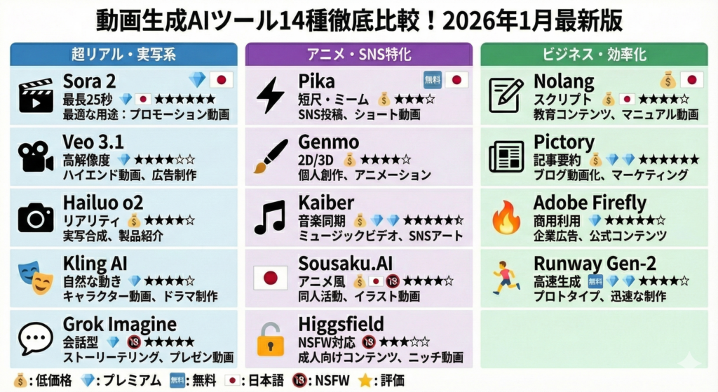どのツールを選ぶかは、あなたの「目的」「予算」「日本語対応の必要性」「NSFW対応の必要性」によって異なります。この記事を参考に、自分に最適なツールを見つけてください。
