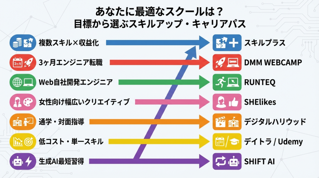 スキルプラスは「複数スキルを組み合わせて収益化したい人」向けに、現時点で最も設計が整ったスクールです。ただし転職保証・コスパ・運営歴の3軸では他社に負けており、目的によっては別サービスの方が合います。