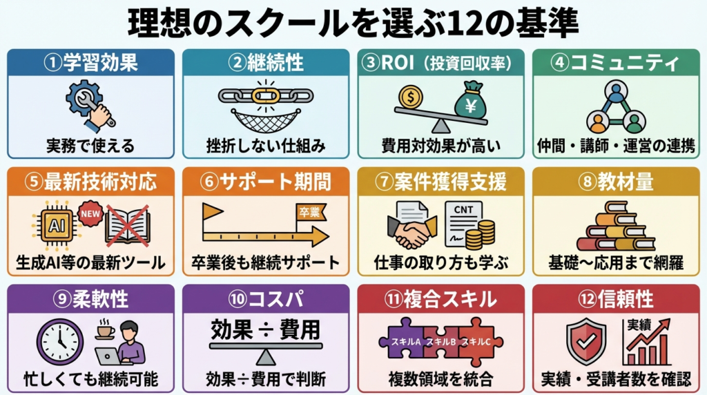 「良さそうだから」という感覚でスクールを選ぶと、契約後に「思っていたのと違う」になります。その失敗を防ぐために筆者が設計した12の評価軸を公開します。軸を先に知っておくことで、比較表のスコアが「なぜこの数字なのか」まで理解できるようになります。