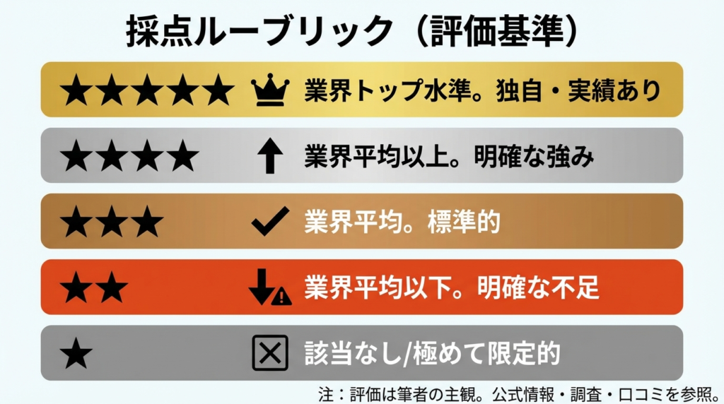以下の評価は、各社の公式情報・第三者調査・受講者口コミをもとに作成しています。星の数(★1〜5)は上記ルーブリックに基づく筆者の主観評価です。