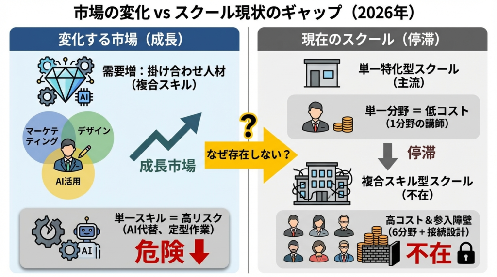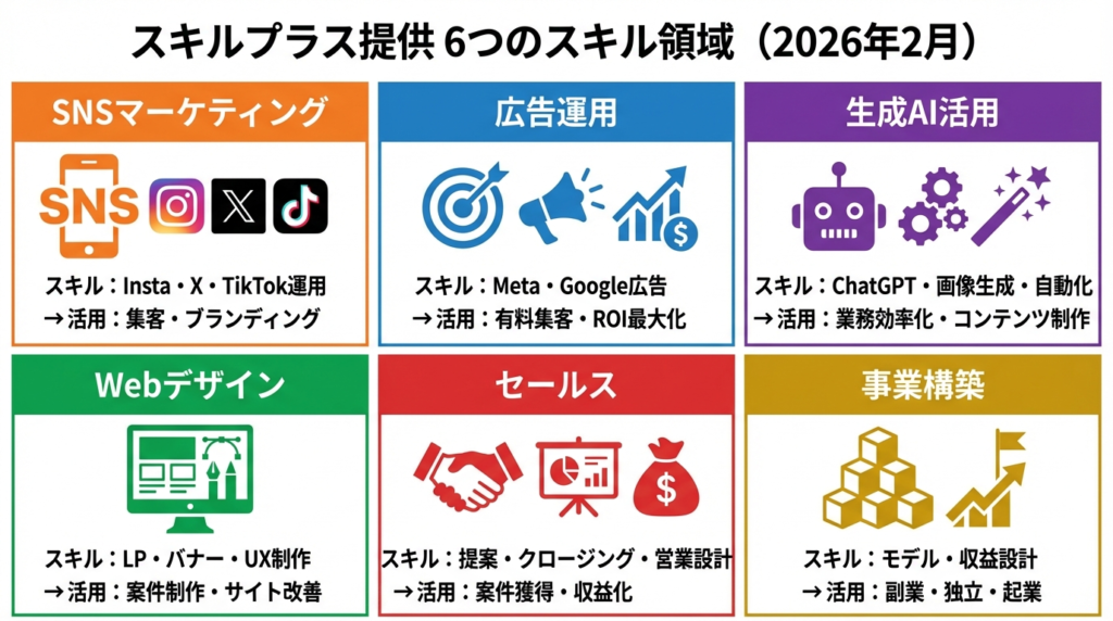 SNS・広告・AI・デザイン・セールスを横断して使えるスキルセットを構築できる。複合スキル型の選択肢として現時点で最も設計が整っている。