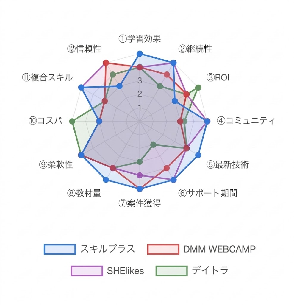12の評価軸で比較した結果、スキルプラスは「複合スキル習得×長期サポート」の組み合わせで優位性を持ちます。ただし、転職保証・コスパ・運営歴では他社に劣る軸があります。各サービスのスコアと「目的別の最適解」を一覧、比較が必要な理由を解説します。1つのスキルだけを安く学びたい場合、スキルプラスより適したサービスがあります。