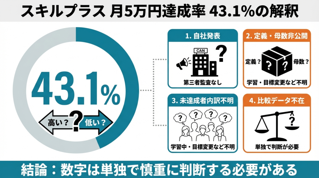 スキルプラスの月5万円達成率は43.1%(2025年9月・公式プレスリリース)。