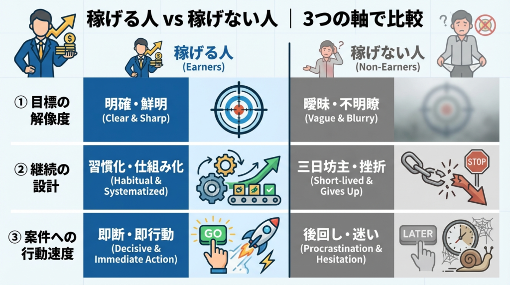 稼げる人と稼げない人の違い|3つの軸で比較