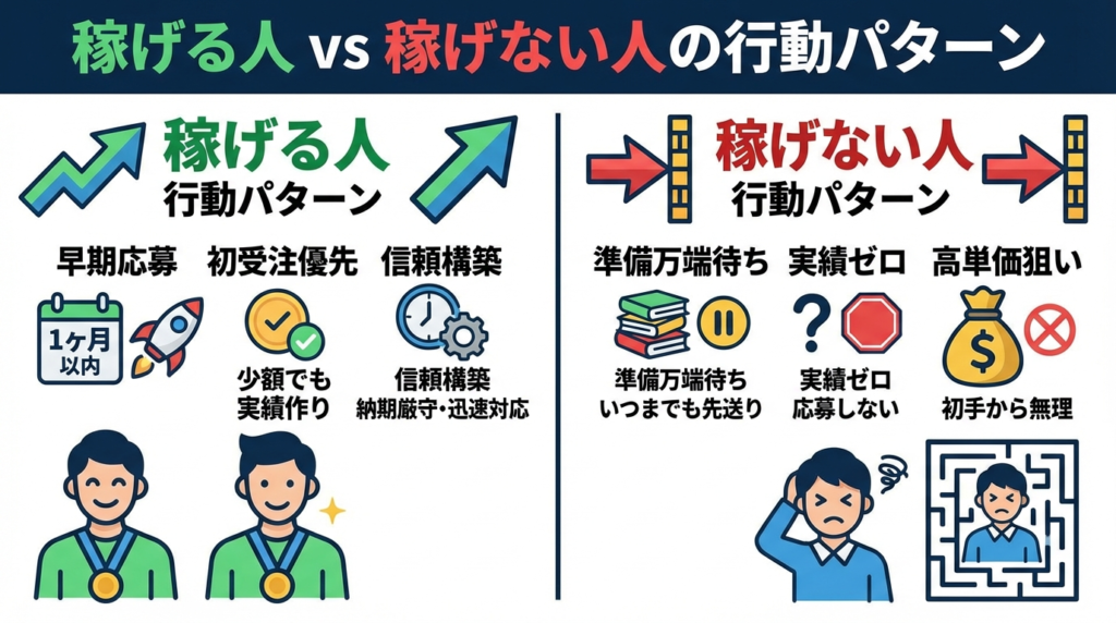 稼げる人はこの連絡を単なる通知として受け取らず、「今日は案件に3件応募する」という具体的な行動に即座に変えています。連絡を受けてから動くまでの時間が、最も差が出るポイントです。