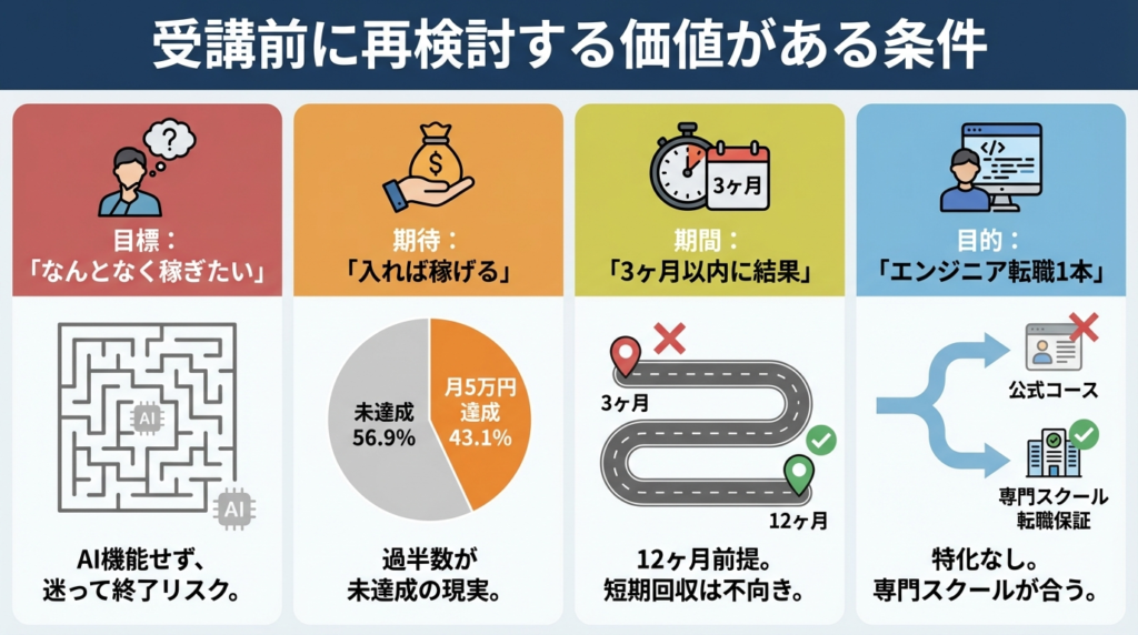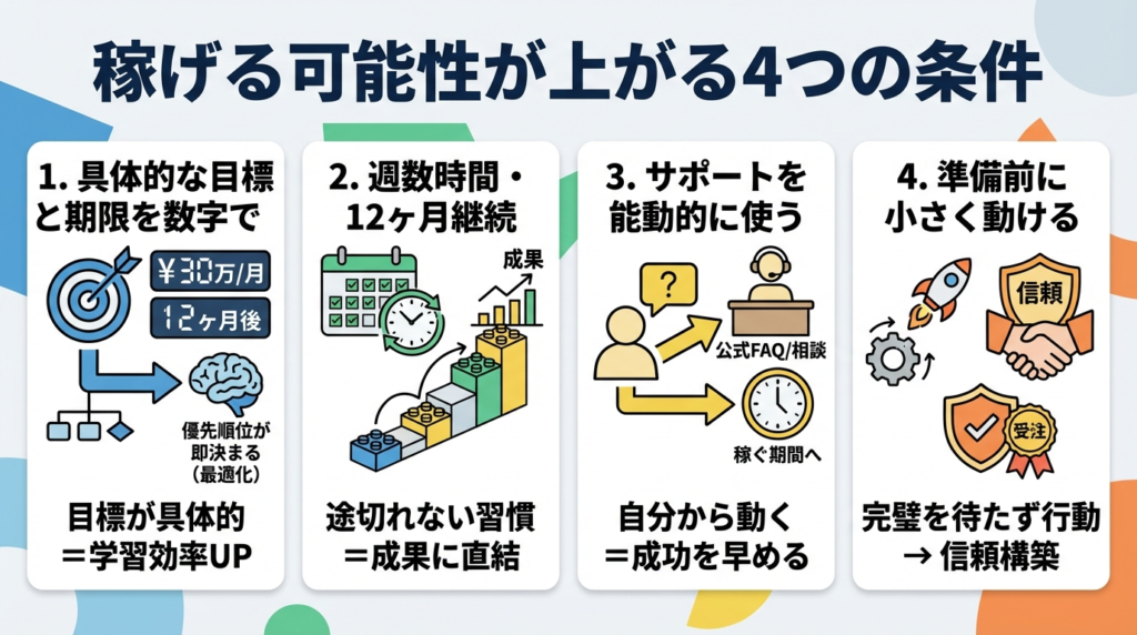 今すぐ確認してほしい問いは1つです。「いつまでに・月いくら・どのスキルで」を数字で言えるか。言えない場合は、受講前に目標を整理しておく価値があります。