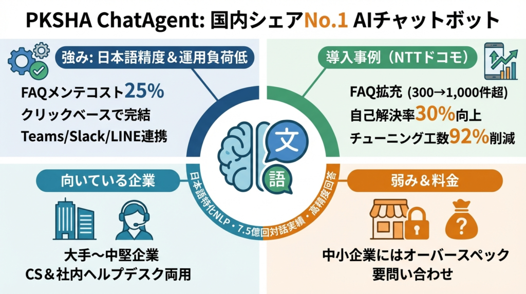 | PKSHA ChatAgent | 4 | 5 | 5 | 2 | 5 | CS・社内両対応 | 要問い合わせ |