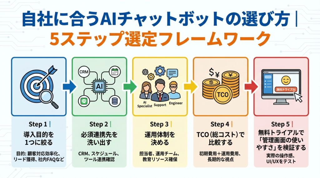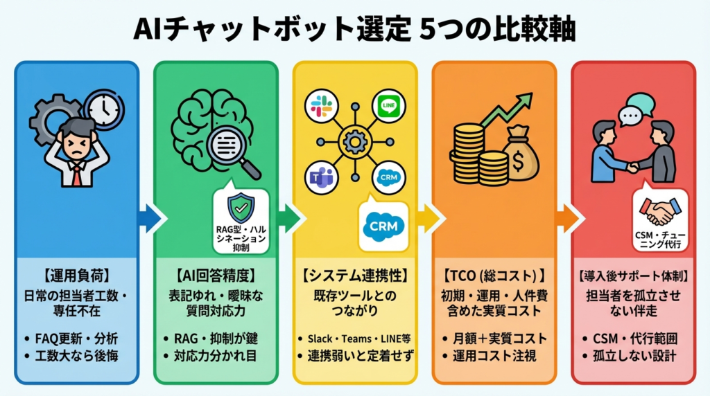 AIチャットボットを選ぶとき、「機能の有無」だけで比較しても判断できない。実際の導入後を左右するのは、運用のしやすさ・精度の安定性・連携の柔軟性・トータルコスト・サポート体制の5つです。