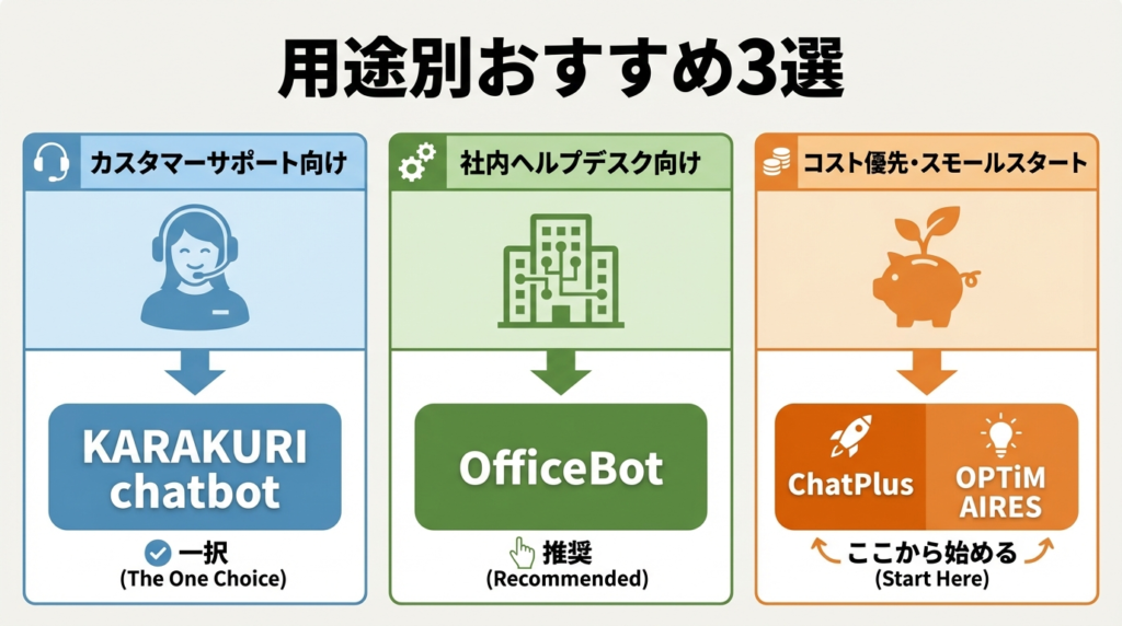 どのサービスが自社に合うかは、用途で絞るのが最速です。