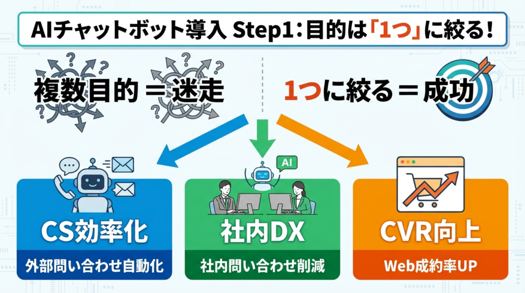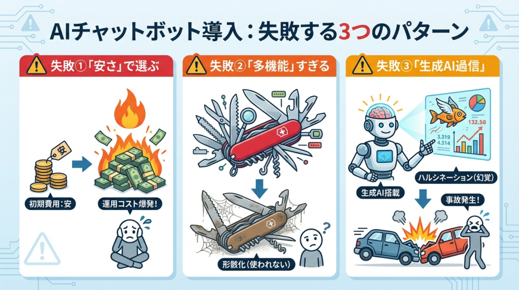 AIチャットボットの選定で失敗する原因の多くは、「月額料金だけで比較する」「目的を絞らずに多機能を求める」「運用体制を決めずに導入する」の3つです。