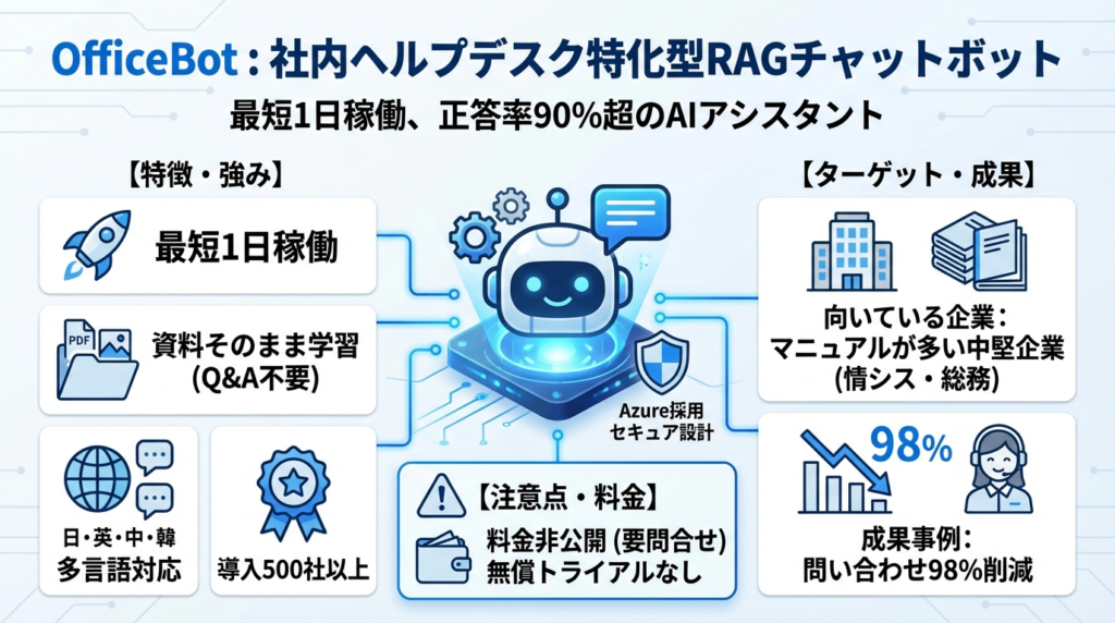 | OfficeBot | 4 | 4 | 4 | 3 | 4 | 社内ヘルプデスク | 要問い合わせ |