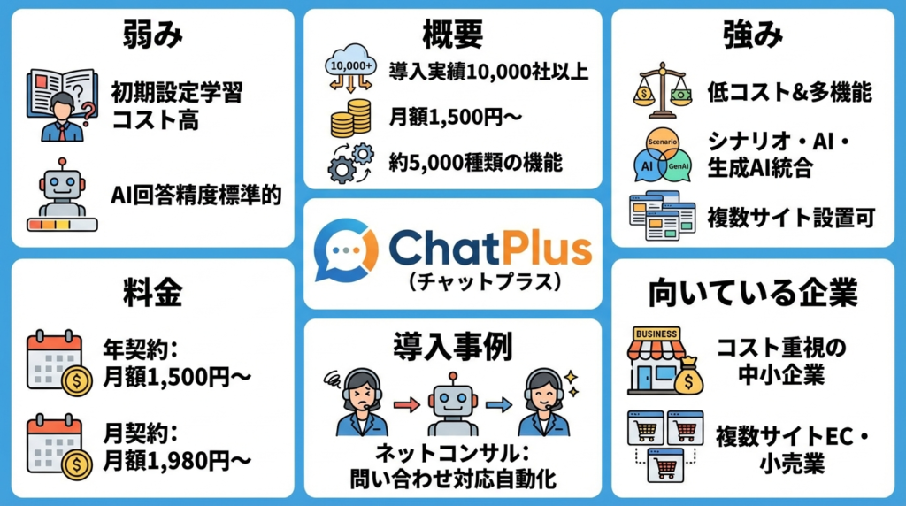 | ChatPlus | 5 | 3 | 4 | 5 | 3 | CS・社内両対応 | 月額1,500円〜※1 |
