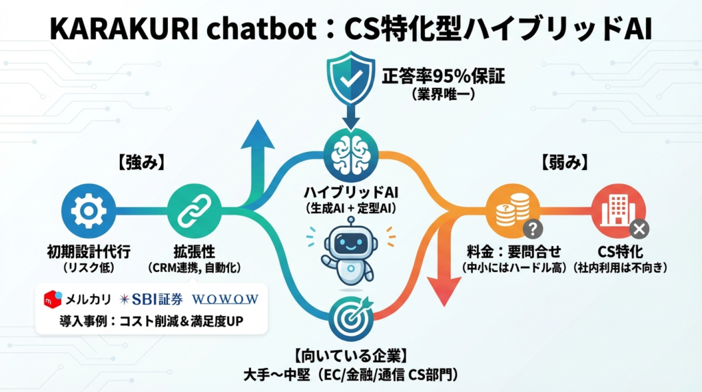 | KARAKURI chatbot | 4 | 5 | 4 | 2 | 5 | CS特化 | 要問い合わせ |