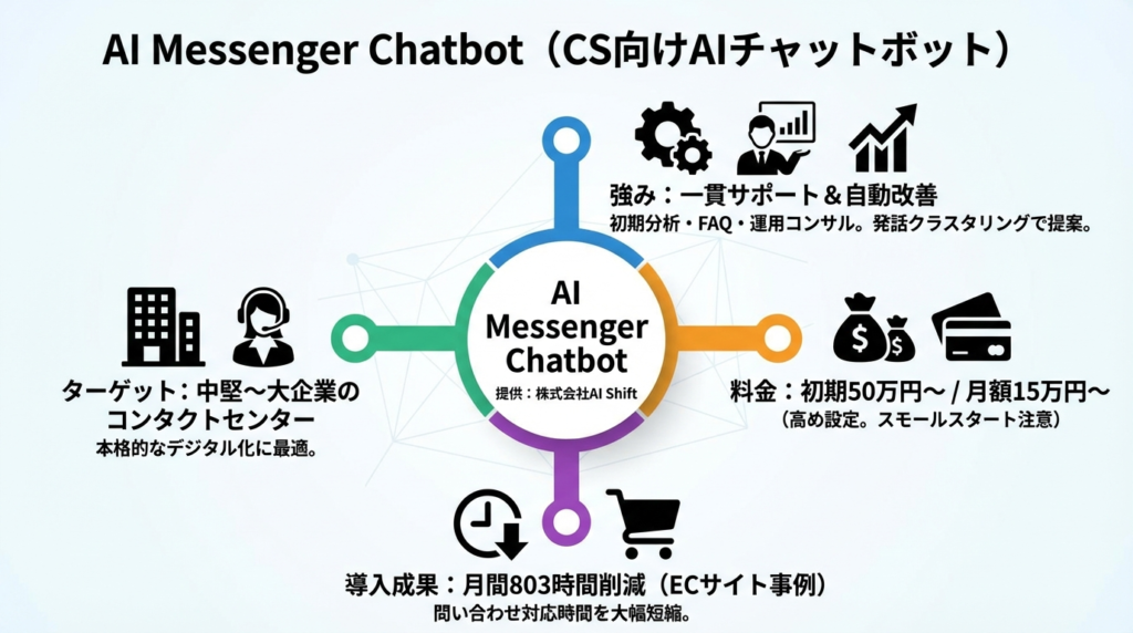 | AI Messenger Chatbot | 3 | 4 | 4 | 2 | 5 | CS特化 | 月額15万〜※3 |