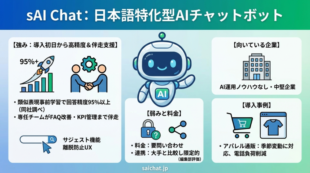 | sAI Chat | 4 | 4 | 3 | 3 | 5 | CS・社内両対応 | 要問い合わせ |