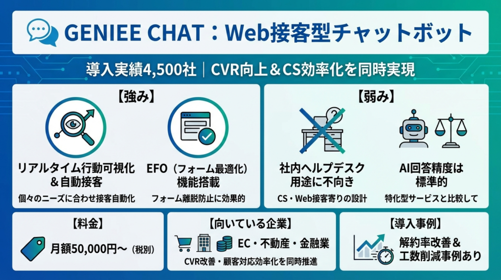 株式会社ジーニーが提供するWeb接客型チャットボット。導入実績4,500社を誇り、CVR向上とカスタマーサポート効率化を同時に実現します。 - 【強み】