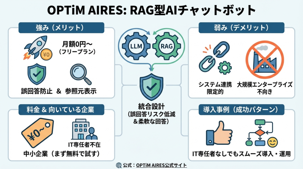 株式会社オプティムが提供するRAG型AIチャットボット。月額0円から使えるフリープランが業界内でも希少で、スモールスタートに適しています。LLMとRAGを統合した設計で誤回答リスクを抑えながら柔軟な回答を実現します。 - 【強み】