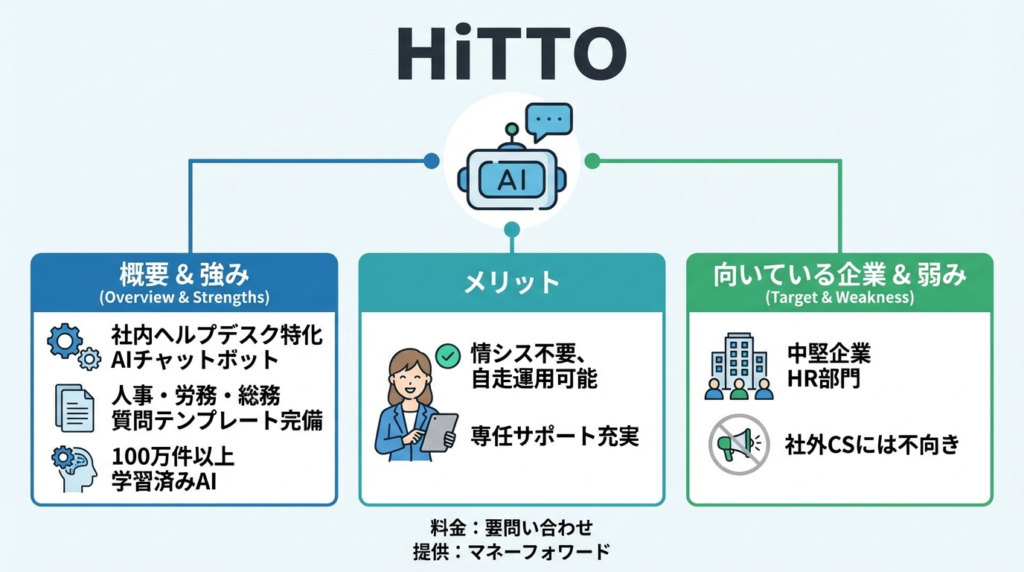 株式会社マネーフォワードが提供する社内ヘルプデスク特化型AIチャットボット(旧HiTTO株式会社が開発し、2024年3月にマネーフォワードへ吸収合併)。100万件以上の質問パターンを学習したAIを搭載し、バックオフィス業務の問い合わせ対応を自動化します。 - 【強み】