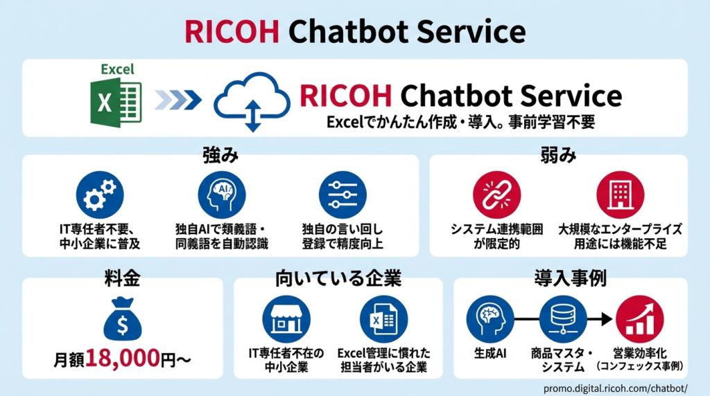 | RICOH Chatbot Service | 5 | 3 | 3 | 4 | 4 | CS・社内両対応 | 18,000円〜※7 |