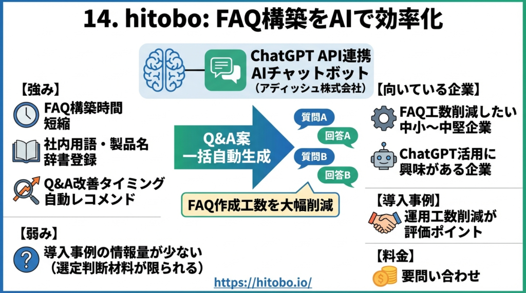 アディッシュ株式会社が提供するAIチャットボット。ChatGPT API連携により複数のQ&A案を一括自動生成できる機能が特徴で、FAQ作成の工数を大幅に削減できます。 - 【強み】