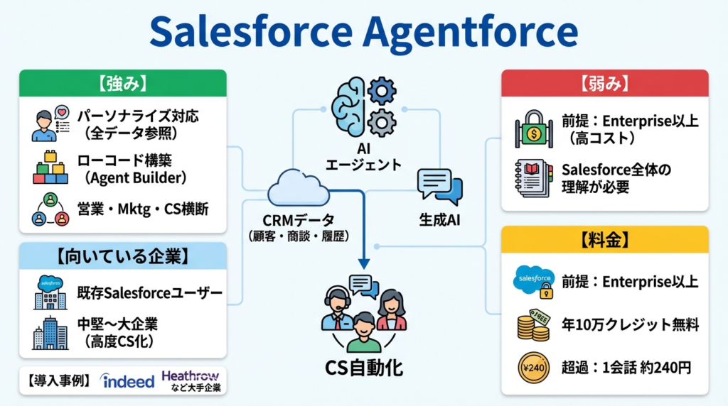 Salesforceの顧客データ・商談データ・サービス履歴を参照して回答を生成するため、パーソナライズされた顧客対応が可能です。ローコードのAgent Builderで設定でき、営業・マーケティング・CSを横断した自動化が構築できます。 - 【弱み】