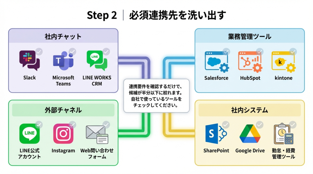 CRM・Slack・Teams・LINEなど既存ツールとどれだけつながるか。連携が弱いサービスは現場に定着しません。