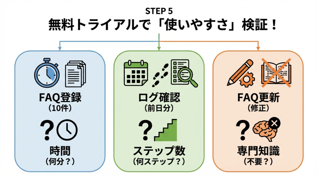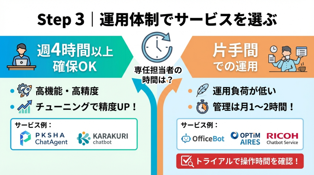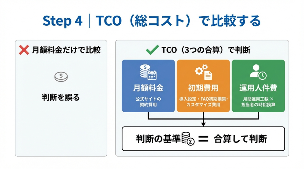 FAQ更新・チューニング・ログ分析などの日常運用にかかる担当者の工数。専任を置けない中小企業ほど、ここで選定を間違えると後悔します。