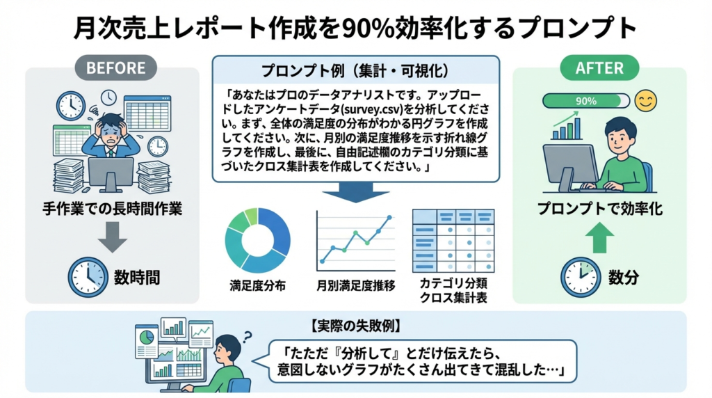 【事例】月次売上レポート作成を90%効率化するプロンプト