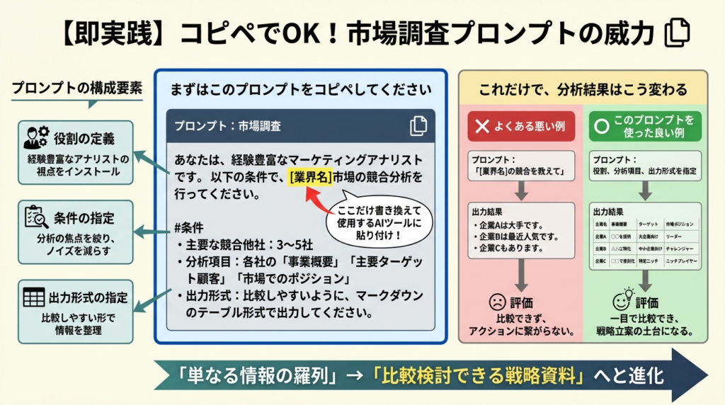 | プロンプト | 「[業界名]の競合を教えて」 | 役割、分析項目、出力形式を指定 |