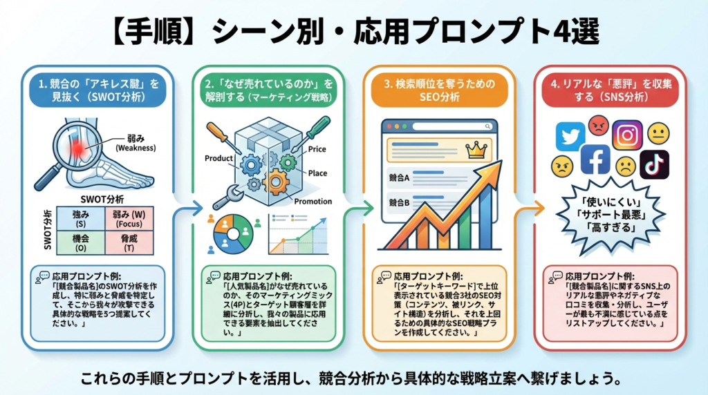 このプロンプトを使うだけで、あなたの分析は「単なる情報の羅列」から「比較検討できる戦略資料」へと進化します。