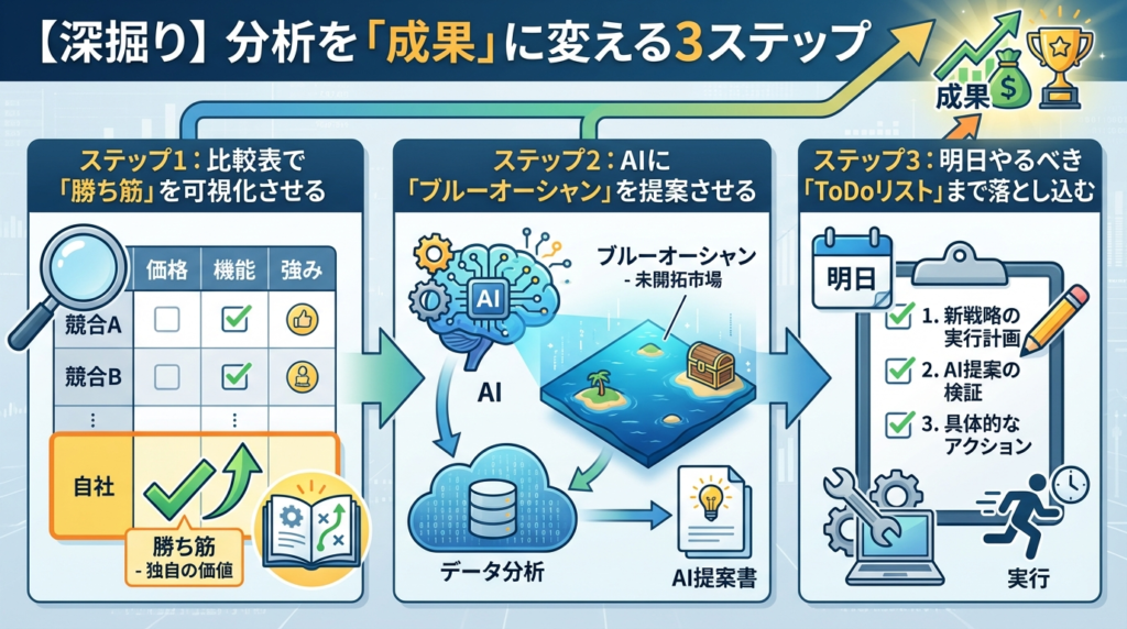 ここまで紹介した手順を踏めば、あなたは「精度の高い分析データ」と「具体的な戦略案」を手に入れることができます。