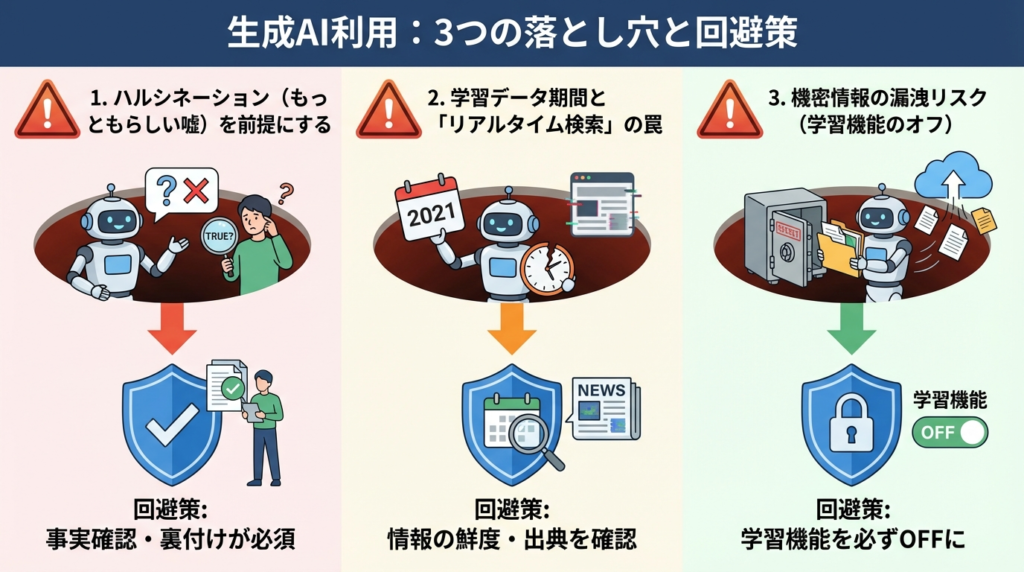 ChatGPTは「超優秀なインターン」ですが、彼には「嘘を自信満々に語る癖」と「口が軽い(学習する)リスク」があります。 競合分析を経営判断に使う以上、以下の3点だけは絶対に守ってください。