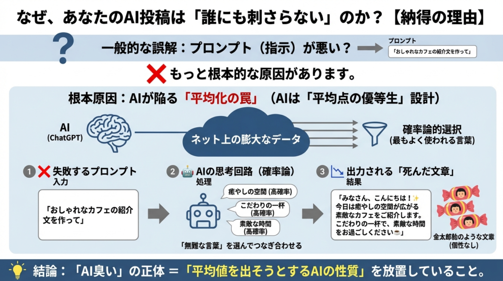 多くの人が「プロンプト(指示)が悪い」と言いますが、もっと根本的な原因があります。 それは、ChatGPTが「平均点の優等生」になるように設計されているからです。
