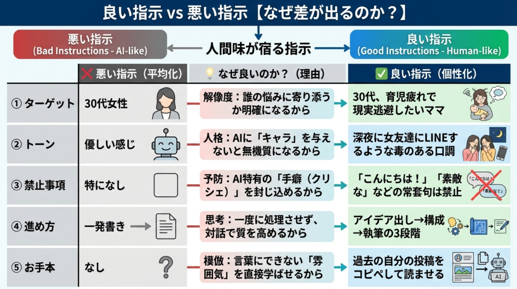 まずは全体像を比較表で見てみましょう。左側が「AI臭くなる指示」、右側が「人間味が宿る指示」です。