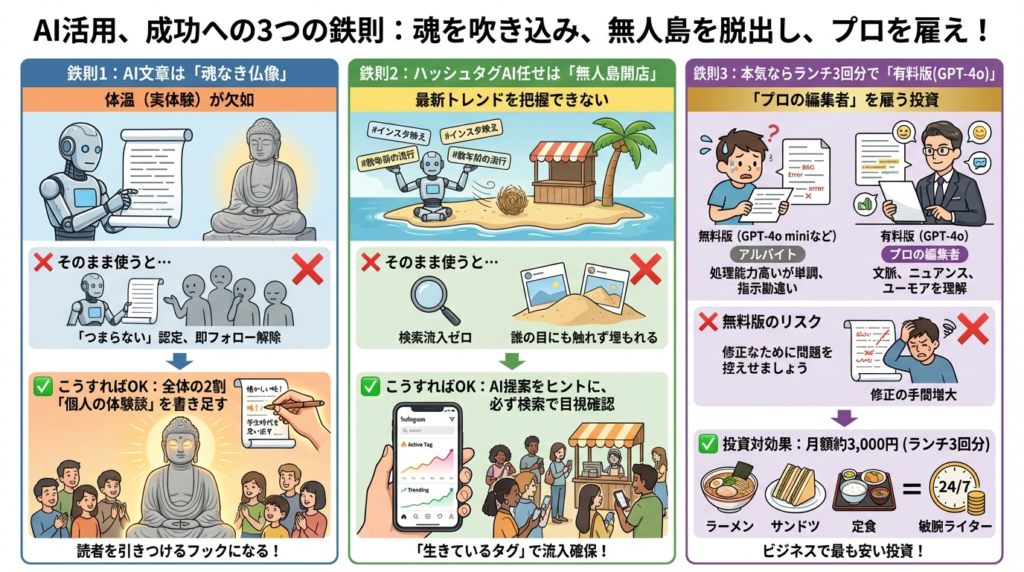 AIは強力な武器ですが、使い方を一歩間違えると、あなたのアカウントの信頼を一瞬で破壊します。 「AIに使われる」のではなく「使いこなす」ために、この3つだけは絶対に守ってください。
