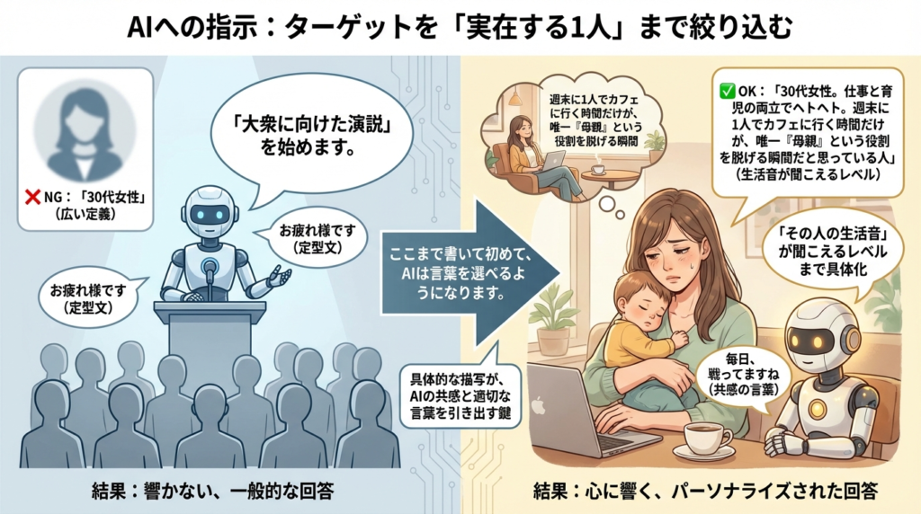 「カフェ好きな人」のような広い定義では、AIは「大衆に向けた演説」を始めます。ターゲットは「その人の生活音」が聞こえるレベルまで具体化してください。
