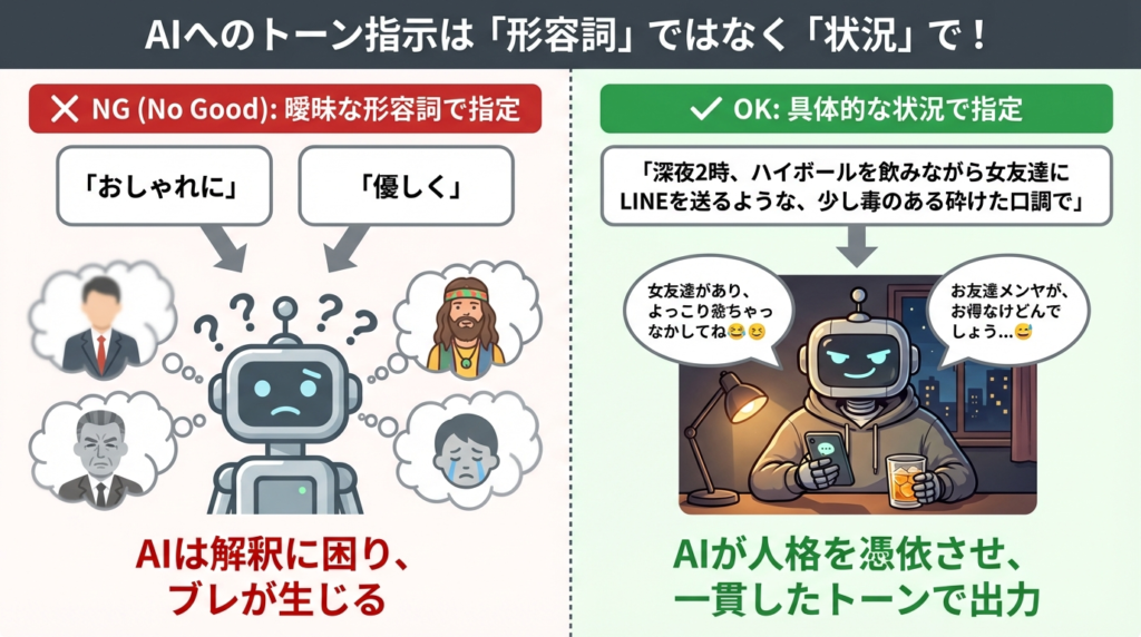 「おしゃれに」「優しく」といった形容詞は、人によって解釈が異なります。AIにとっては曖昧すぎるのです。具体的な「シチュエーション」を与えることで、AIに人格を憑依させます。