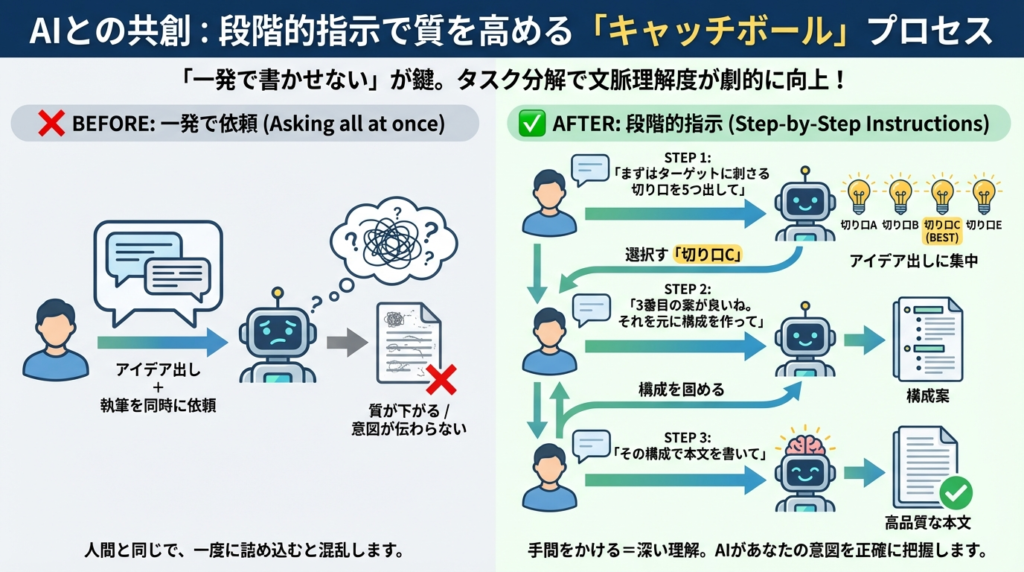 人間でも「アイデア出し」と「執筆」を同時にやると質が下がりますよね。AIも同じです。タスクを分解して、キャッチボールをしながら進めることで、文脈理解度が劇的に向上します。