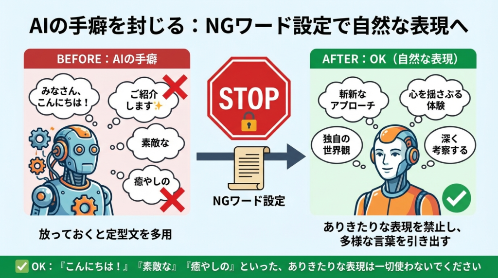 ③ 禁止事項特になし「こんにちは!」「素敵な」などの常套句は禁止予防:AI特有の「手癖(クリシェ)」を封じ込めるから