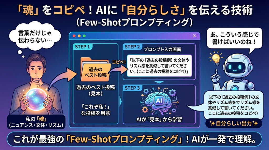 ⑤ お手本なし過去の自分の投稿をコピペして読ませる模倣:言葉にできない「雰囲気」を直接学ばせるから