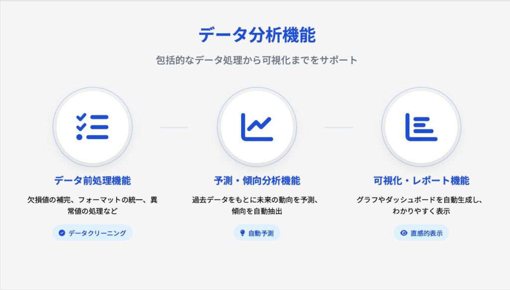 AI分析ツールには、分析の効率と精度を高めるための多彩な機能が搭載されています。
