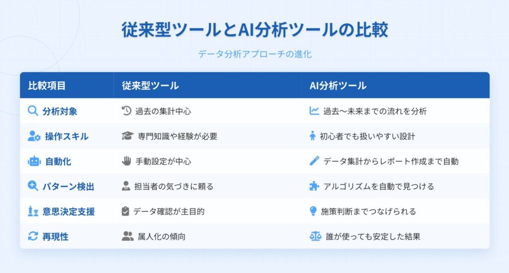それに対してAI分析ツールは、機械学習などの技術を使って、想定していなかった関係性や変化の兆しを自動で見つけることができます。人の分析では気づきにくいパターンもAIが大量のデータから発見し、予測や意思決定のサポートにつなげます。