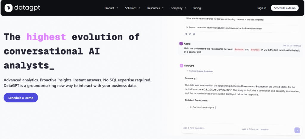 DataGPTは、チャット形式でデータ分析を進められるAIアナリストです。ダッシュボードを作り込むことなく、自然言語での質問により必要な数値や傾向をすぐに把握できるため、非エンジニアでも使いやすい構成です。