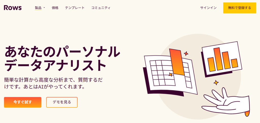 Rowsは、AIアナリスト機能を備えたスプレッドシート形式のプラットフォームで、データの取得・整形・共有を効率よく処理できます。表計算に慣れたユーザーが、自然言語の質問で分析やレポートを直感的に進めたいときに適した設計です。