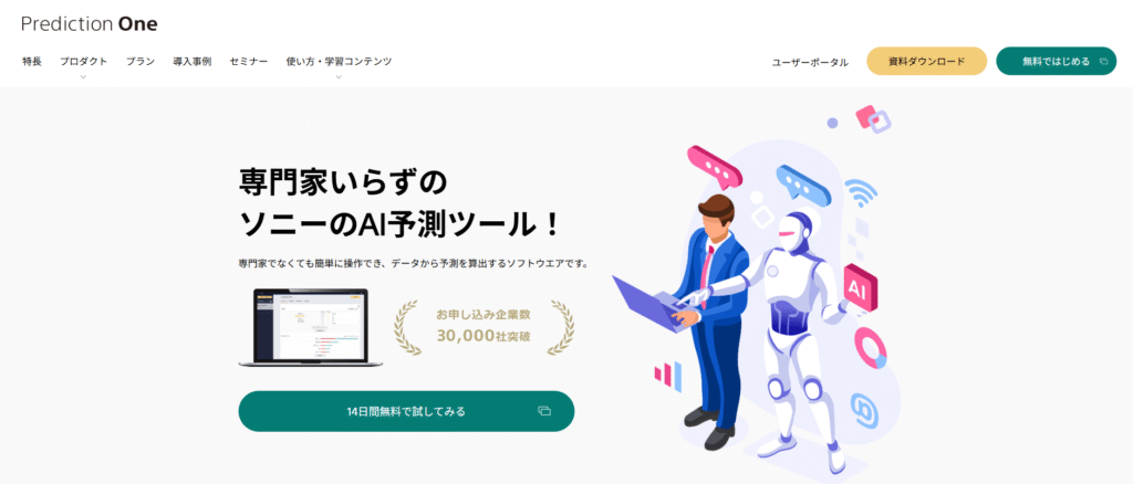 Prediction Oneは、Sony提供の機械学習ソフトで、専門知識なしでも予測モデルを構築できます。売上予測や顧客分析などの予測分析を、手軽かつ高精度で行いたい中小企業には非常に魅力的な選択肢です。