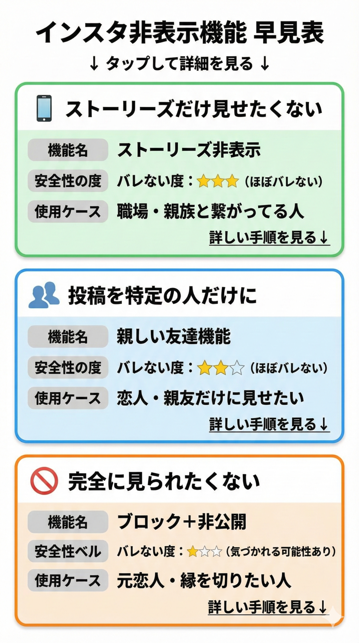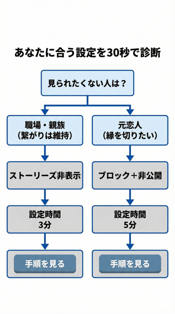 | ストーリーズだけ見せたくない | ストーリーズ非表示 | バレにくい | 職場 / 親族 / 知り合いなど、関係は続けたいけど距離を置きたい |