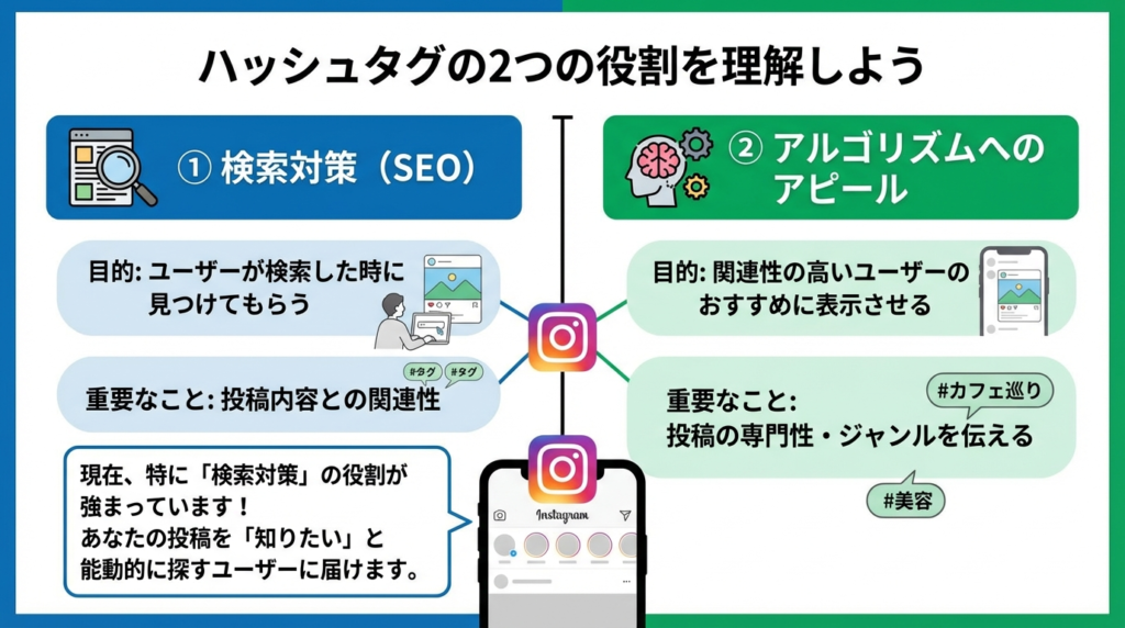 ハッシュタグ戦略を立てる上で、その役割を正しく理解しておくことが重要です。ハッシュタグには、大きく分けて2つの役割があります。
