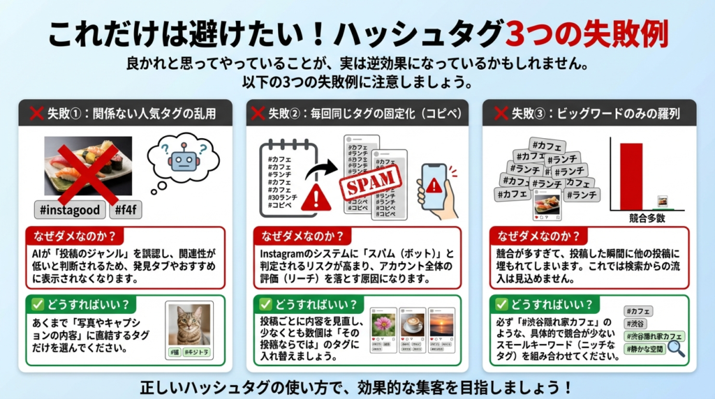 【特に注意】 「#instagood」や「#f4f」のような、投稿内容と直接関係のないハッシュタグは、もはや効果がないどころか、アカウントの評価を下げる原因になるため、絶対にやめましょう